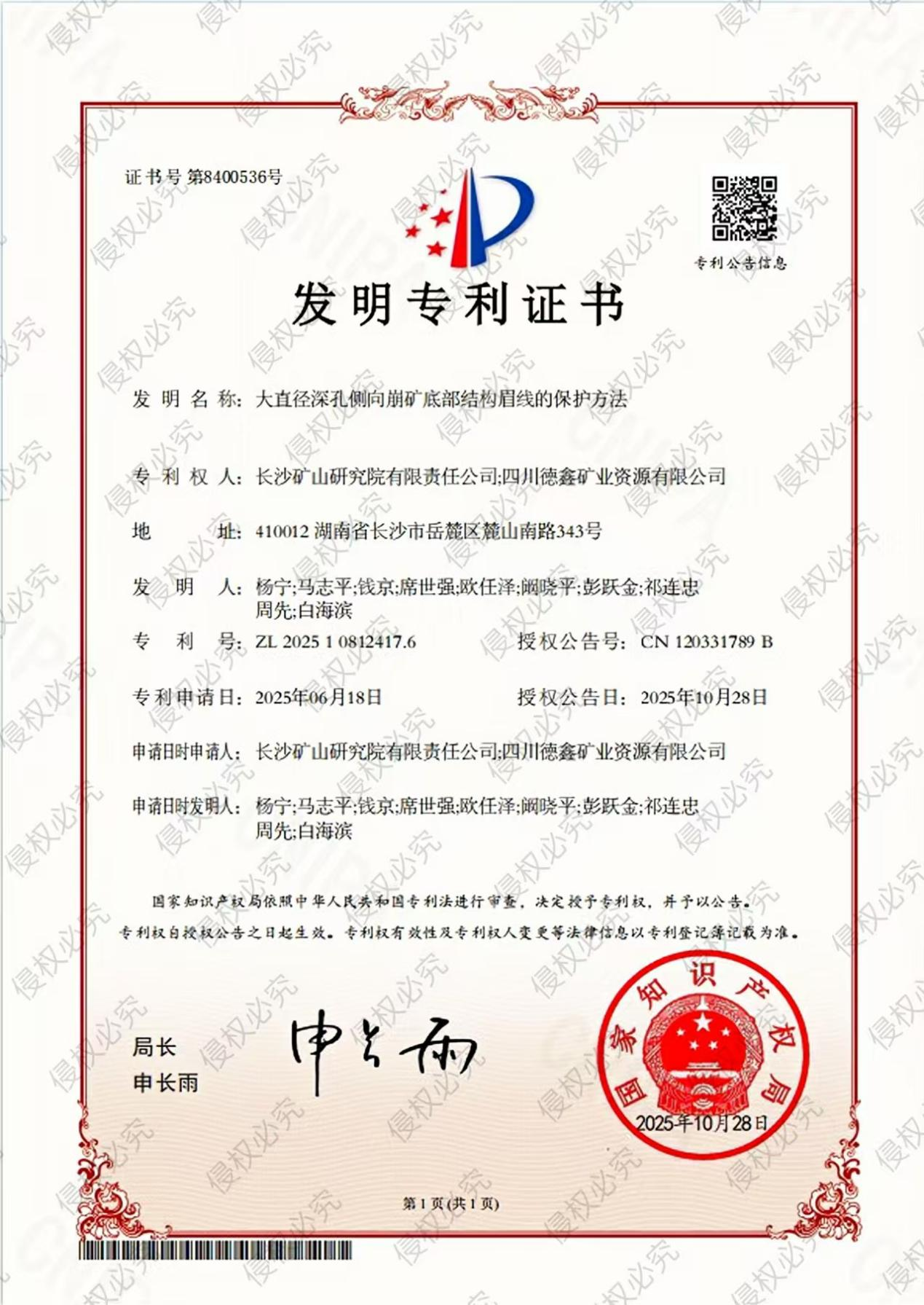 近日,川能動力旗下鋰業(yè)公司所屬四川德鑫礦業(yè)公司 “大直徑深孔側(cè)向崩礦底部結(jié)構(gòu)眉線的保護(hù)方法”獲國家知識產(chǎn)權(quán)局發(fā)明專利授權(quán)。該技術(shù)破解了李家溝礦山深孔采礦眉線易破壞的行業(yè)難題,為集團(tuán)鋰電產(chǎn)業(yè)鏈資源高效開發(fā)提供關(guān)鍵技術(shù)支撐。